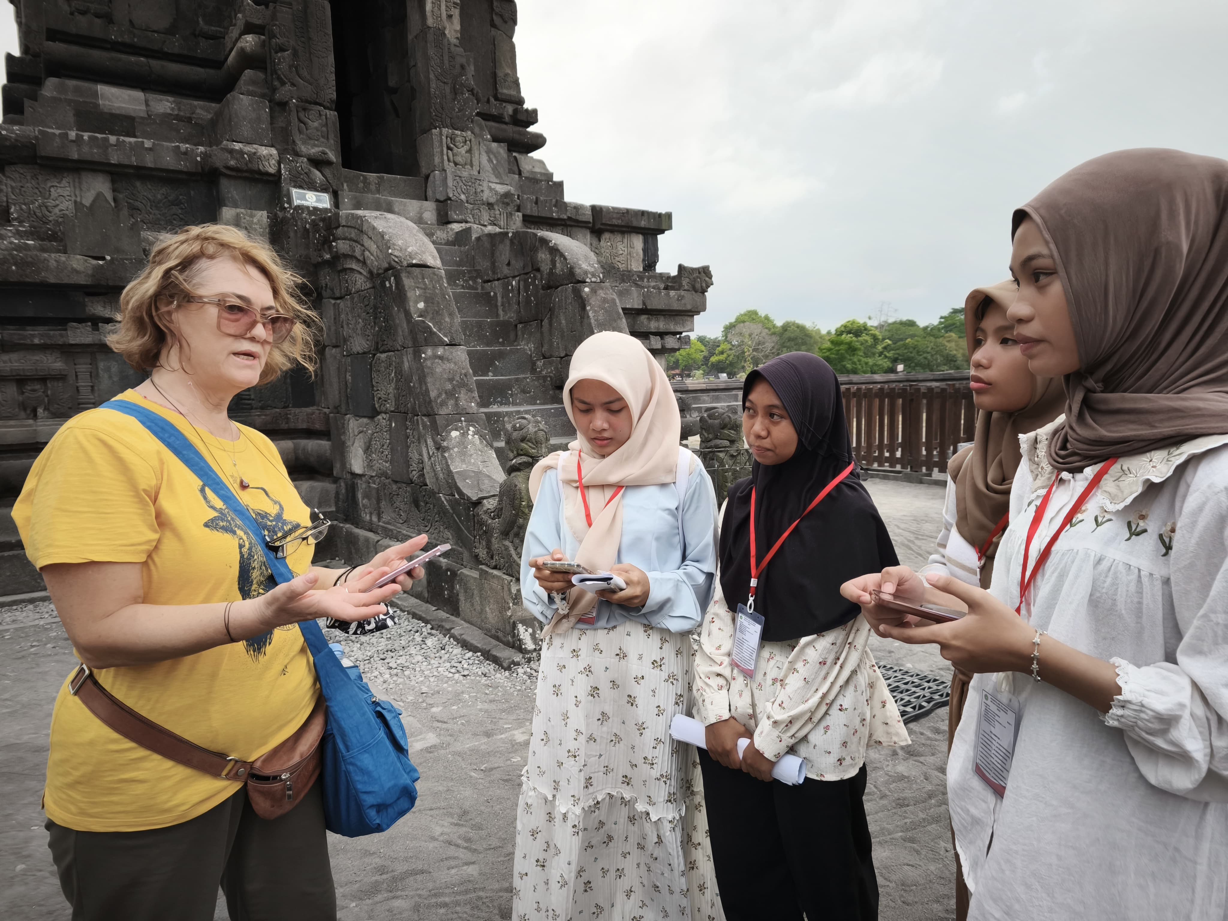 Candi Prambanan: Selain mendalami pengetahuan sejarah, siswa memanfaatkan kesempatan ini untuk berinteraksi dengan pengunjung asing sebagai ajang praktik kemampuan speaking (berbicara) mereka.