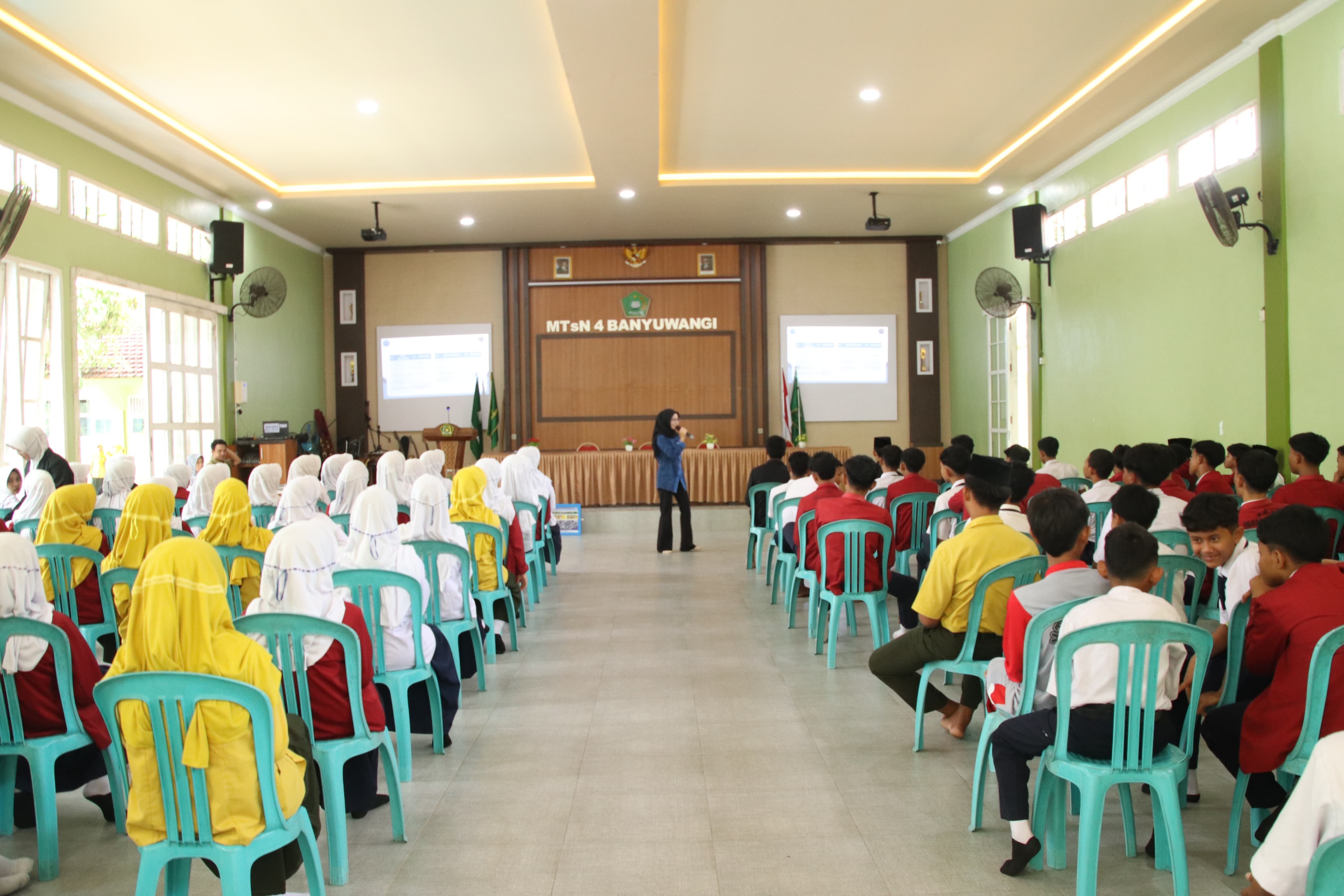Kepala MTsN 4 Banyuwangi menyambut baik dan sangat mendukung penuh kegiatan ini sebagai bagian penting dari pembinaan karakter dan kesehatan mental siswa. Antusiasme terlihat jelas dari para siswa perwakilan kelas yang mengikuti seluruh rangkaian materi sosialisasi dengan penuh perhatian dan semangat.